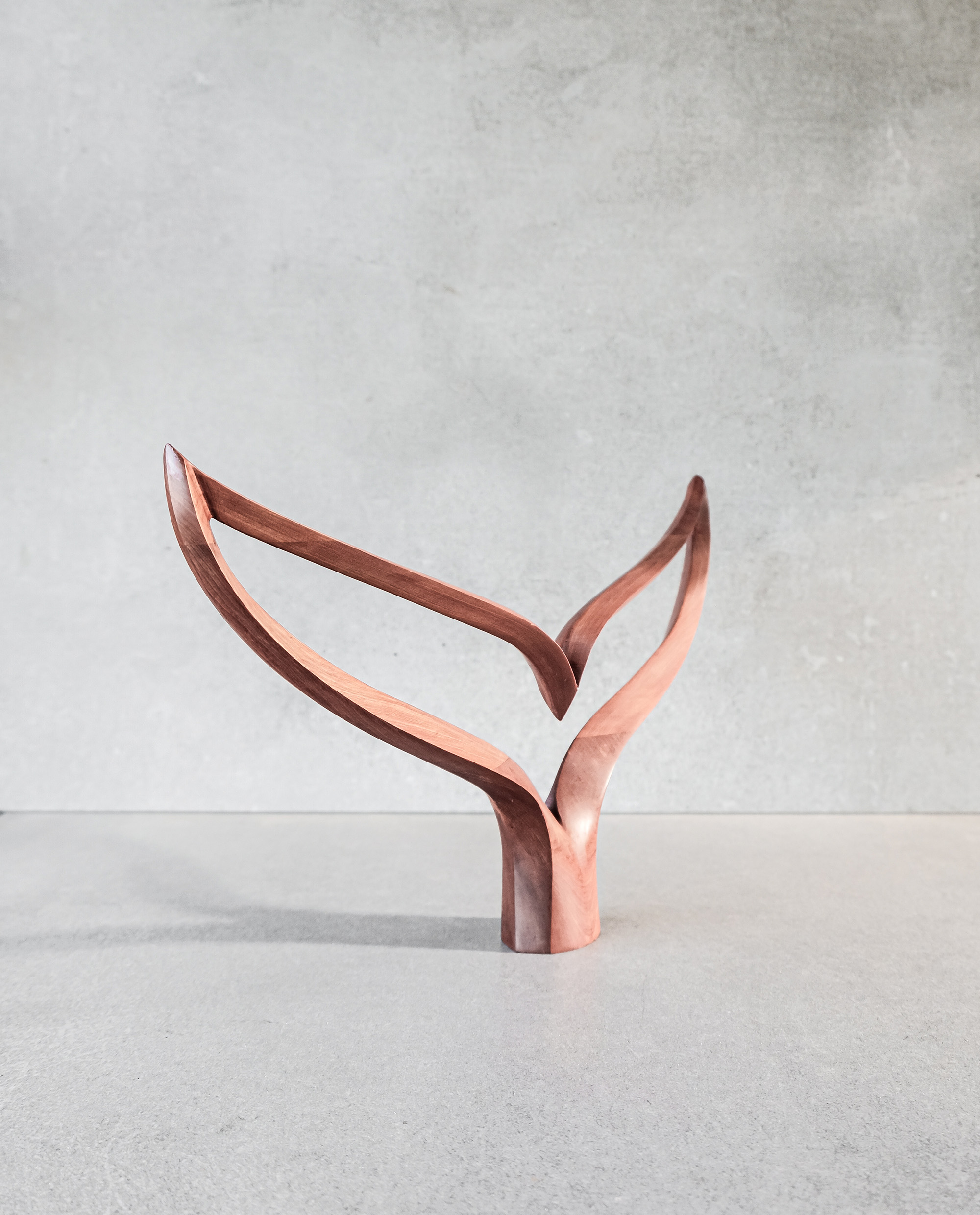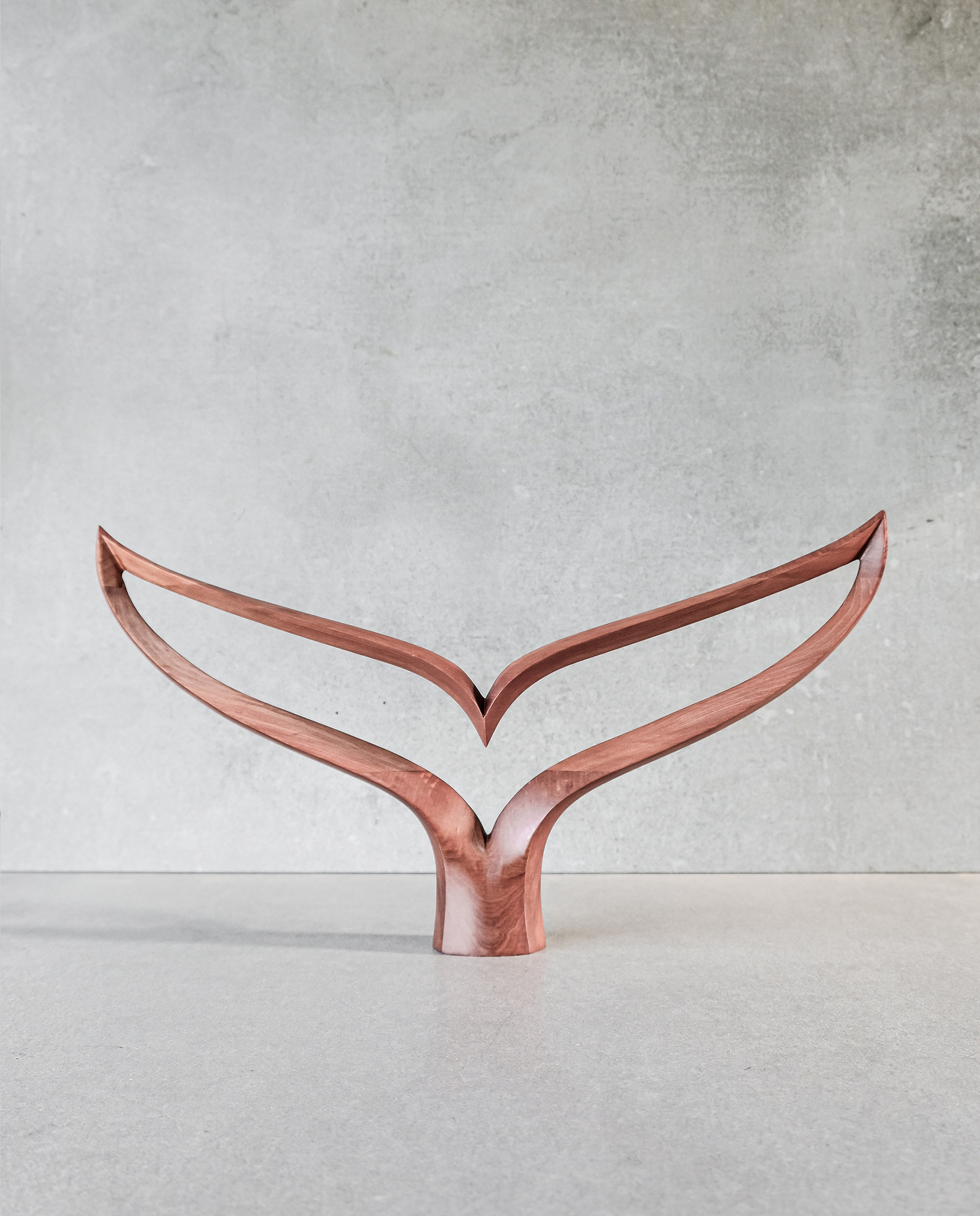 Intricately carved abstract whale tail sculpture, capturing the essence of the breaching tail before a dive.