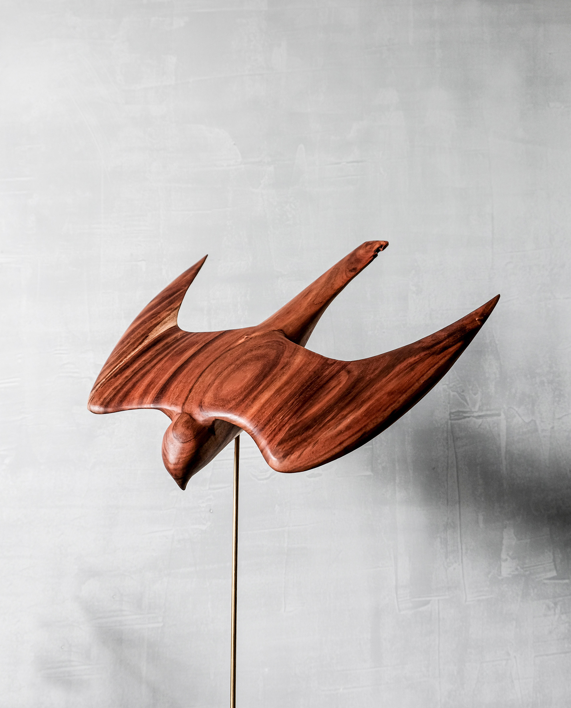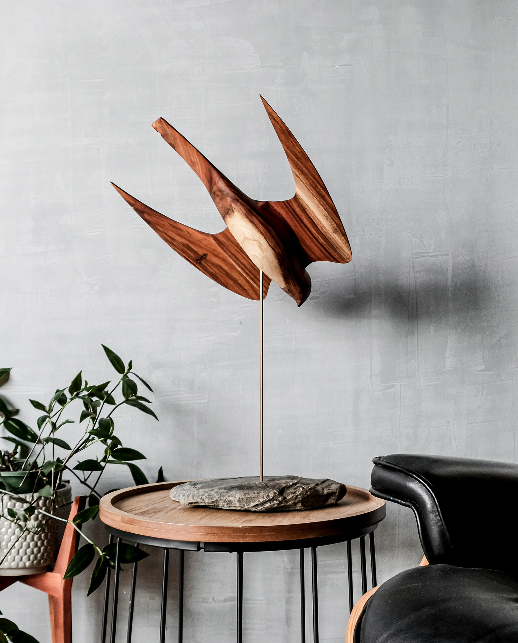 Mounted on a brass rod and anchored into a natural schist stone base, the sculpture conveys both movement and stability, as if the falcon is frozen mid-flight, locked onto its prey. The deep, flowing grain of Tasmanian blackwood, enhanced by a Danish oil finish, adds warmth and depth, making each piece one of a kind.