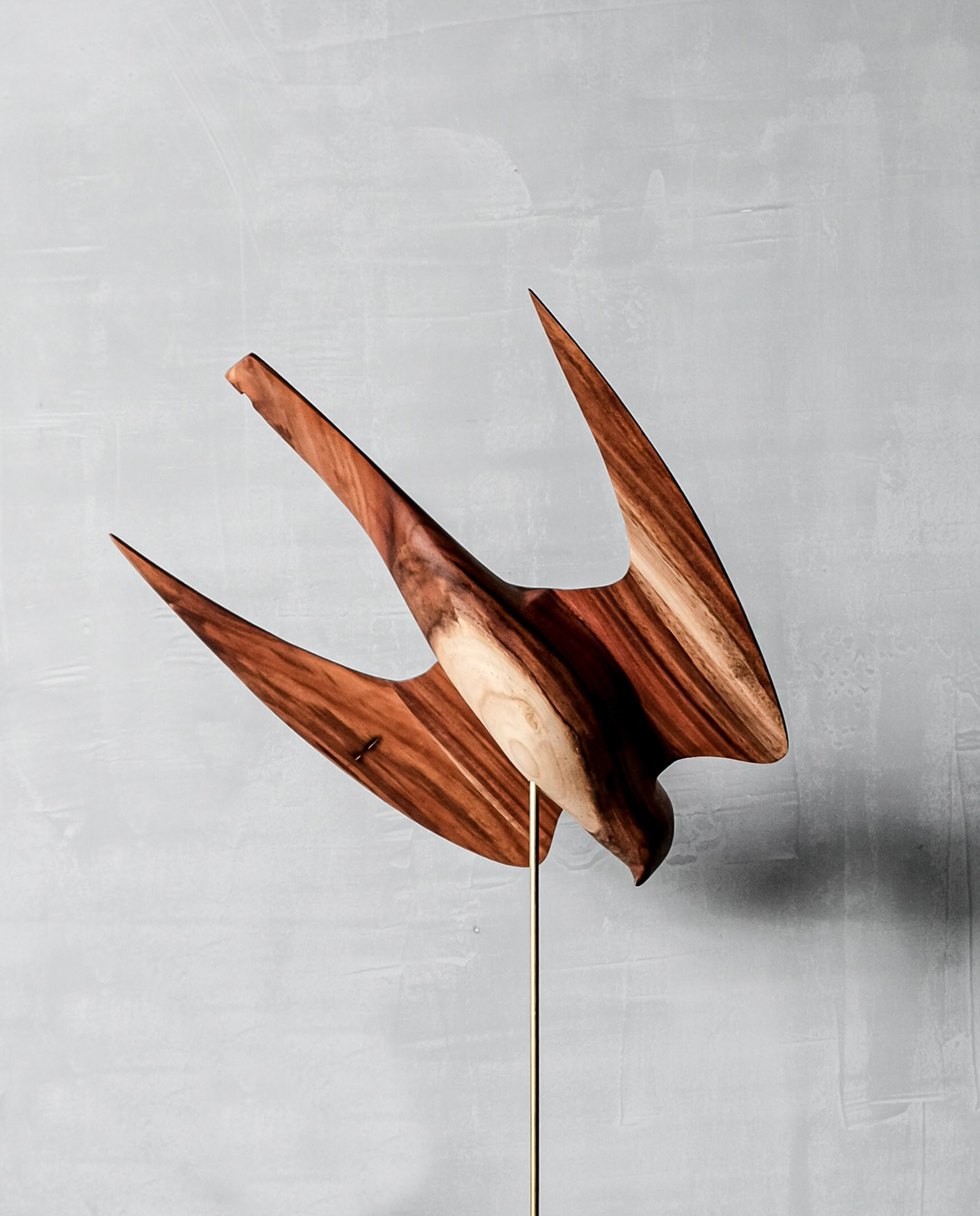 Carved abstract falcon – Kārearea swooping and diving in flight.