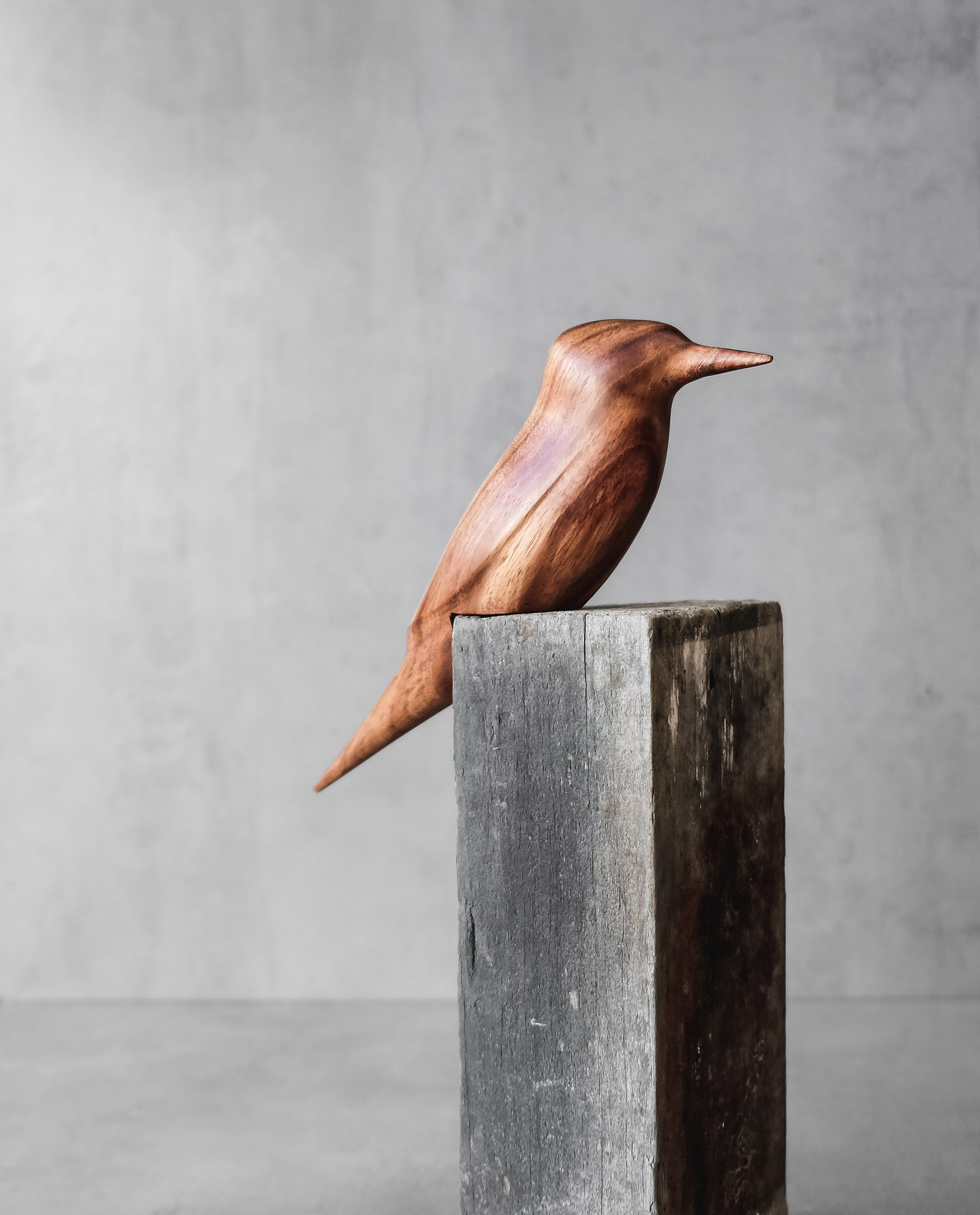 Carved minimalist Kingfisher sculpture, happy just to hang out on any edge or ledge. Made from Tasmanian blackwood.