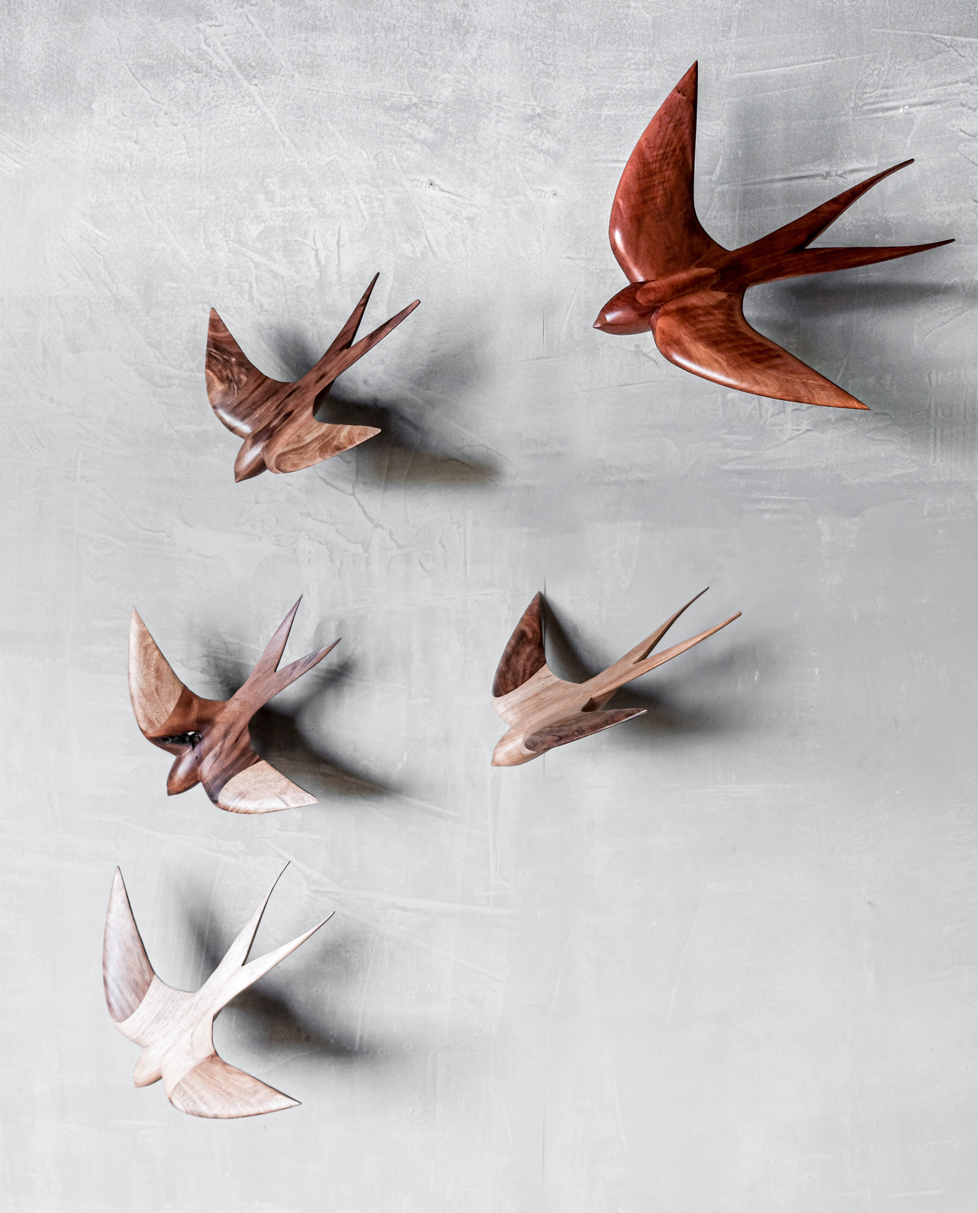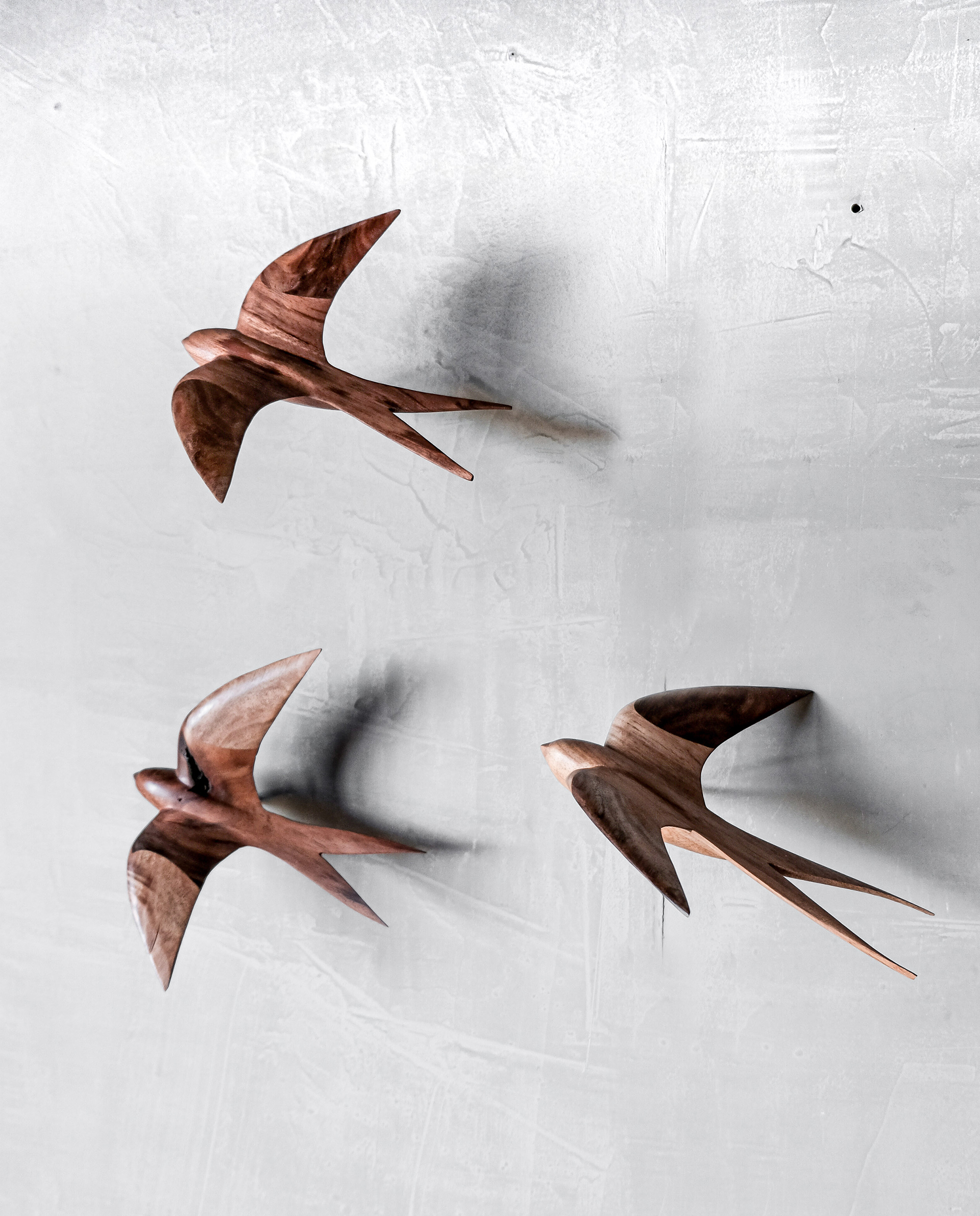 This design works well on its own, but truly comes alive in a group of two or three. Arranged together, the swallows create a gentle rhythm across the wall, echoing the movement of birds in the open air.