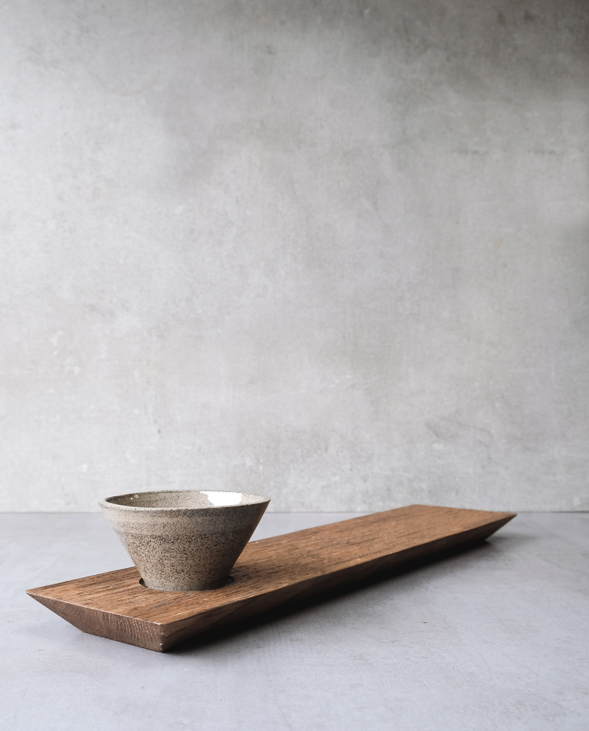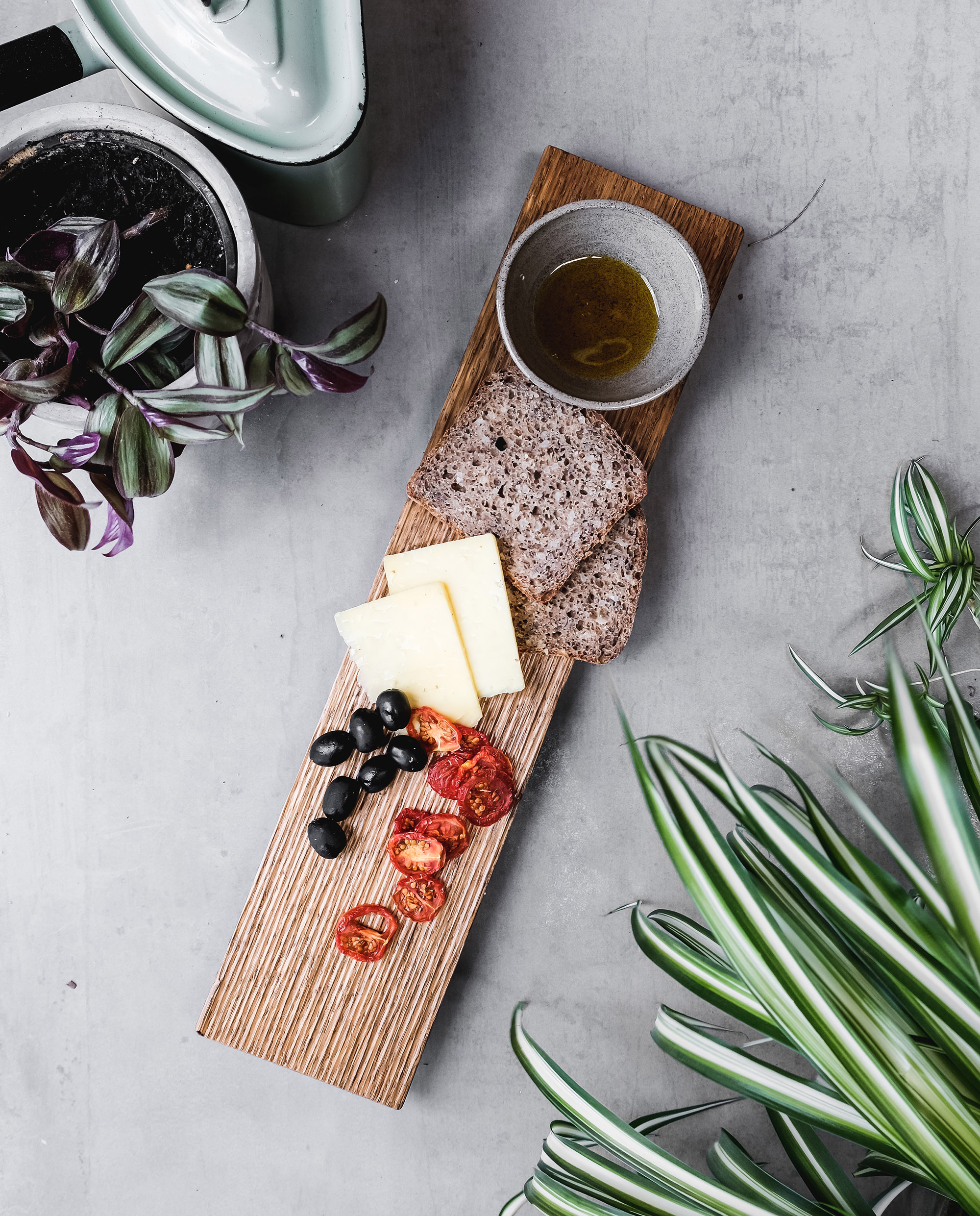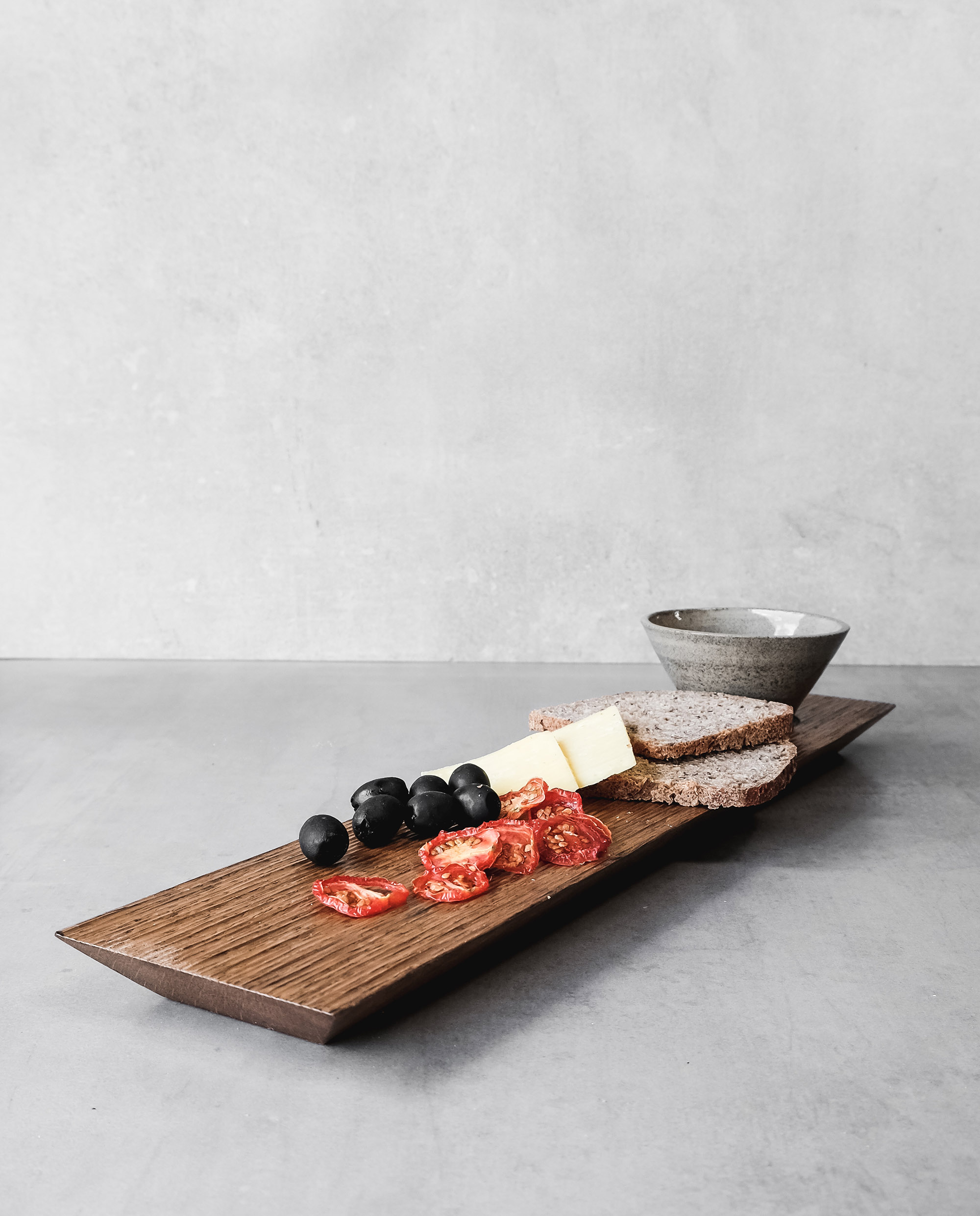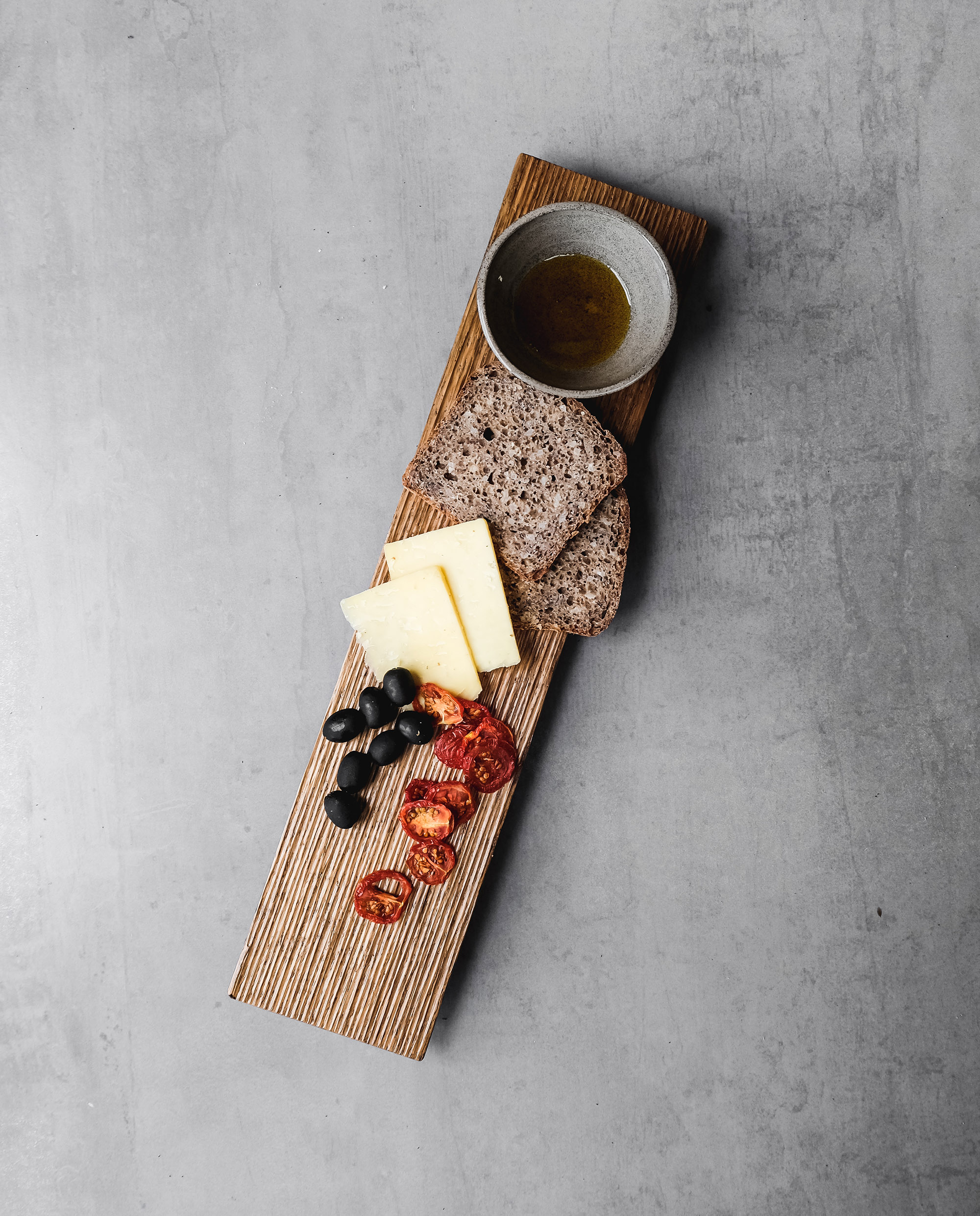 Hand-made cheese platter/serving tray with a hand-thrown olive oil/olive dish made by Arete earthware. The tray has a subtle carved texture top and the dish has a recess carved in to locate it in place. Each tray has been carved from a custom-selected oak piece of timber and has then been coated in a food-safe oil.